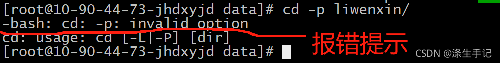 -P :注意,这个P是大写的,小写的是不生效的,系统也会有报错提示。这个参数的意义就在于我们在把一个路径做了符号链接【下文会有讲解】之后,普通的cd只会进入这个目录下,加上-P参数之后,我们就可以进入到这个目录链接到的目录,也是这个目录数据真实的存储目录。
