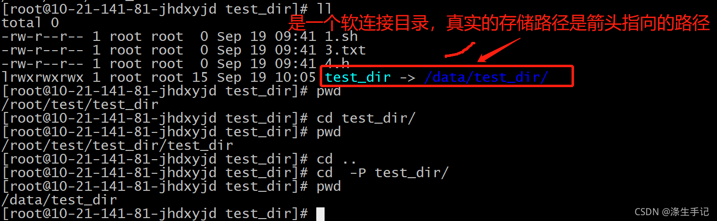[root@10-21-141-81-jhdxyjd test_dir]# cd -P test_dir/ ##进入目录指向的真实路径