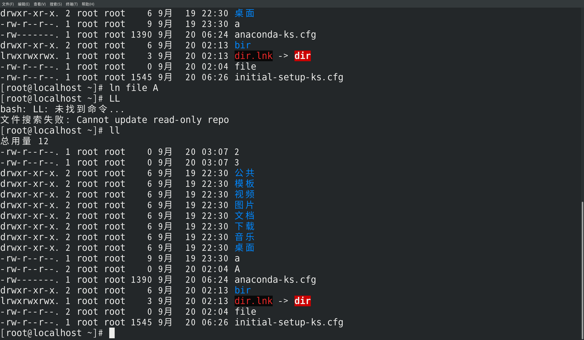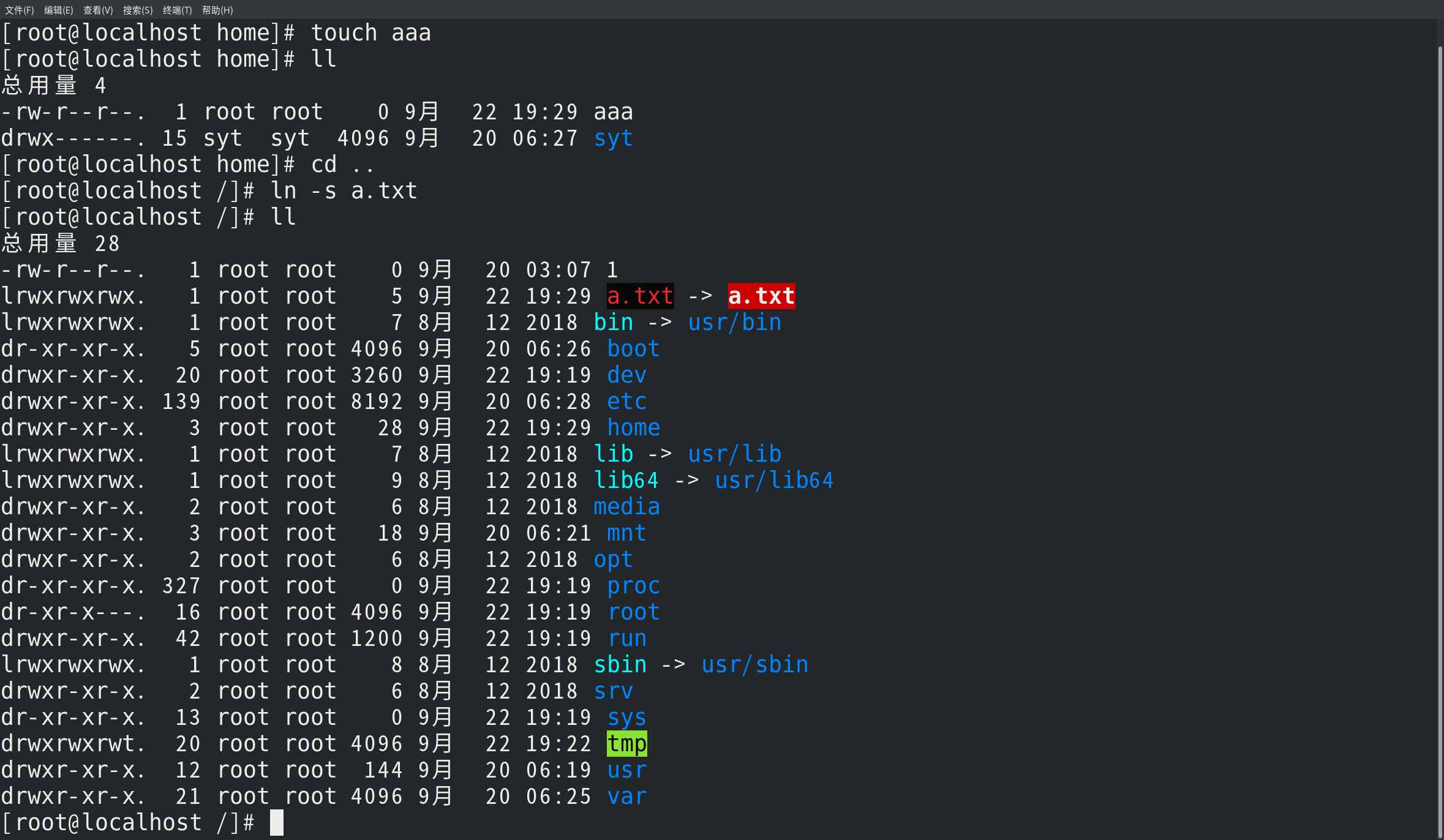 d 目录文件,类似于文件夹 c 字符设备文件,串行端口设备,顺序读写,键盘 b 块设备文件,可供存储的接口设备,随机读写,硬盘 p 管道文件,用于进程间的通信 s 套接字文件,通常用于网络上的通信。可以启动一个程序来监听客户端的要求,客户端可以通过套接字来进行数据通信 l link,链接文件 硬链接,只能引用同一文件系统中的文件。它引用的是文件在文件系统中的物理索引(也称为inode)。 当移动或者删除原始文件时,硬链接不会被破坏,因为它所引用的是文件的物理数据而不是文件在文件结构中的位置。 硬链接记录的是目标的inode。 符号链接又叫软链接,和原文件不是一个文件。例如Windows的快捷方式,如果原始文件被删除, 所有指向它的符号链接也就都被破坏了。符号链接记录的是目标的path。 符号链接可以跨越文件系统,也可以为目录建立。软链接有自己的node, 是linux特殊文件的一种,作为一个文件,它的数据是它所连接的文件的路径。 ls -l 以长列表方式列出 =ll ls -r 逆序列出 ls -d 查看当前目录. ls -ld 长列表列出当前目录的详细信息 ls -lh 显示目录或文件大小 ls -a 列出隐藏文件,包括.和… ls -A 列出隐藏文件,不包括.和…