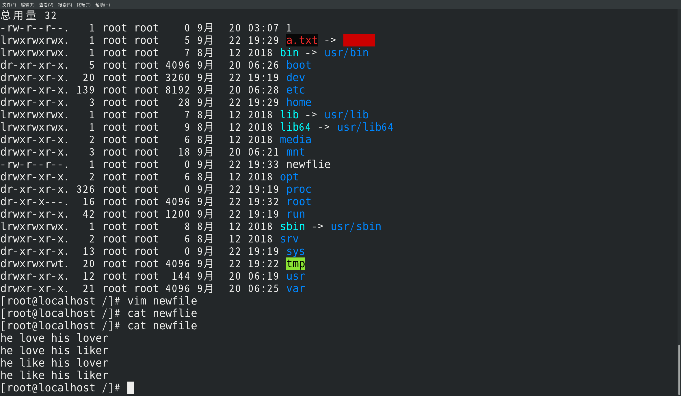 软硬连接区别: 1.软链接可以理解成快捷方式。它和windows下的快捷方式的作用是一样的。 2.硬链接等于cp -p 加 同步更新。 创建软硬链接文件:   创建100个文件: 在newfile文件中编写: 整理: 重启:reboot 关机:poweroff 查看 IP 地址:ip a / ifconfig 获取IP地址:dhclient 强制终止进程 :kill - 进程号 [用户名@主机名 工作目录],#代表root用户的提示符,$代表普通用户的提示符 切换用户:su - 用户名 修改主机名:hostname 查看当前工作目录:pwd 修改密码:passwd 删除密码:passwd - d 用户名 破解密码: ip a 和 ifconfig 的区别: ip 和 ifconfig 命令都可以用来配置网络接口,但它们做事方法不同。如果你想查看主机的 IP 地址或网络接口信息, ifconfig (不带任何参数)命令提供了一个很好的总结。新的 ip 命令提供了类似的结果,但命令是 ip address show, 或者简写为 ip a。 创建普通文件:touch 格式:touch [OPTION]… FILE… touch的两种用法: 1、如果文件已存在,更新文件的三个时间,stat可以查看文件的详细信息 atime access time 看了一下内容 cat mtime modify time 文件内容被改变了,ctime也会发生改变 ctime change time 元数据被改变,重命名 2、如果文件不存在,则表示创建文件 创建多个普通文件: 方法1:touch 文件名1 文件名2 文件名3 方法2:touch {文件名1,文件名2,文件名3} touch {1,2}{3,4} touch abc{1…100} 删除普通文件:rm [-f] 文件名