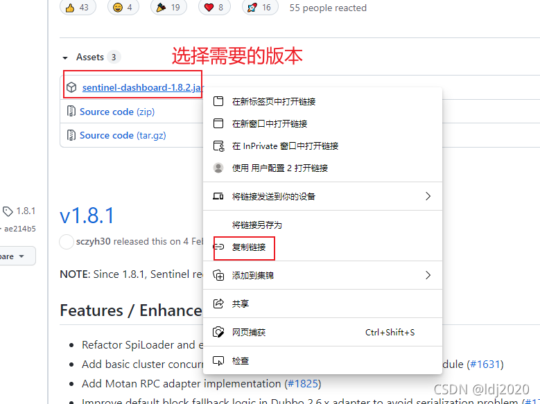1.点击下方链接,右键复制链接,用于拼接下面的Linux命令sentinel下载地址 https://github.com/alibaba/Sentinel/releases