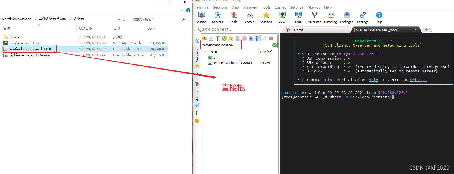 1.打开虚拟机,Mobaxterm工具连接虚拟机,创建多级目录,用于存放下载好的sentinel安装包