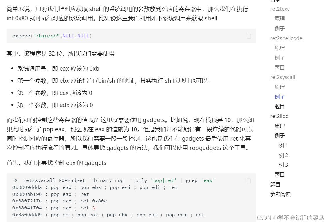 解析:这句话就是在rop二进制文件中找存在pop|ret指令的所有地址。后面的|grep是linux自带的筛选工具,意思是把含eax的指令筛选出来。