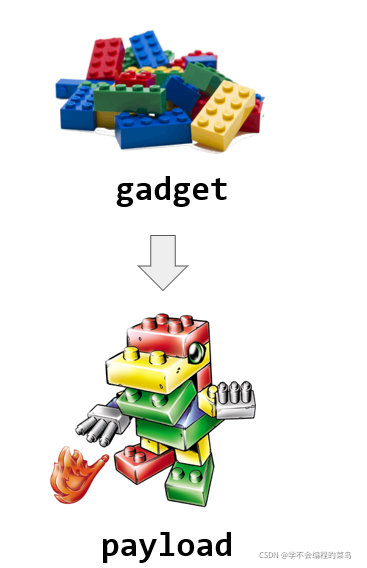 (这个过程起始就类似于堆积木:积木碎片在房子的各个角落,我们得找到所有的积木碎片,放在这里就是在整个程序中找到可以组合成调用execve('/bin/sh")函数的碎片。)