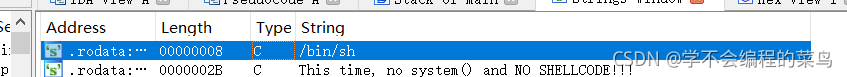 没有system,也没有可直接利用的后门函数,但是有bin/sh。什么也没有。而且段都是不可执行段,也不能直接写入整个shellcode段。