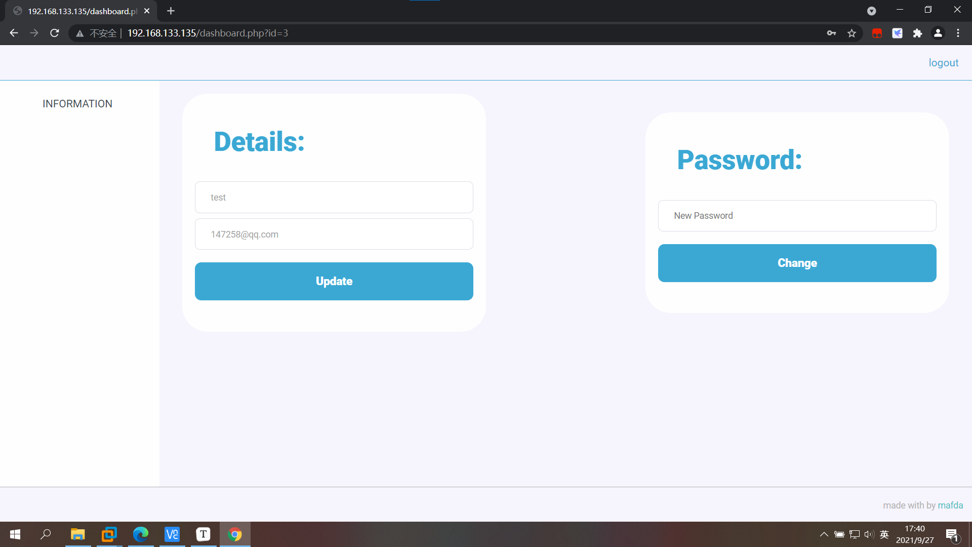 发现页面可以修改用户名与密码,尝试抓包,观察修改过程,修改密码:12345