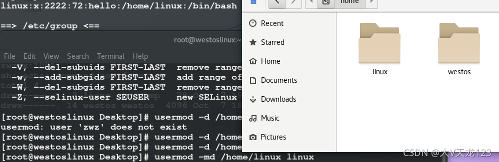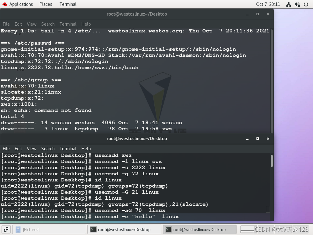 ?注:不加-r删除时,监控窗口显示用户组信息没有被删除,此时再建立zwz时,会报家目录存在,所以在删除用户时要加-r,来递归删除zwz的系统配置文件