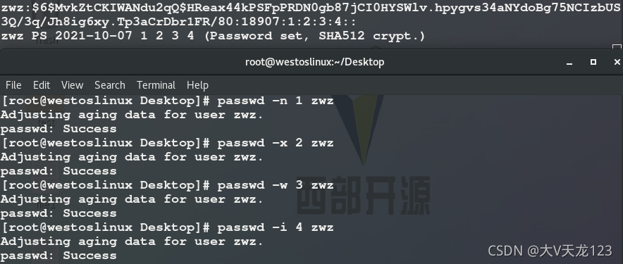? passwd -e zwz? ? ? ? ? ? ? ?##密码最后一次被更改的时间清零 chage? ? -d? 0 zwz? ? ? ? ? ##修改默认使用时间为0,账号必须改密码才能登陆系统 ? ? ? ? ? ? ?-d 18636 zwz? ??##修改最后一次被更改密码的时间 chage? ?-d 18636 zwz? ? ?##也可修改最后一次密码被更改时间? passwd -x 30 zwz? ? ? ? ???##更改最长有效期 ?? chage? ?-M 30 lee? ? ? ? ?? ##也可修改最长有效期 ? ? ? ? ? ? ? ? ? ? ? ? ? ? ? ? ? ? ? ?##30天内zwz用户必须更新密码否则会被冻结 passwd -n 1 zwz? ? ? ? ? ? ?##更改最短有效期 ? zwz在1天内不能改密码 chage? ?-m 2 zwz? ? ? ? ? ? ?##也可更改最短有效期 passwd -w 2 zwz? ? ? ? ? ? ?##更改警报期,密码过期警告 chage? ?-W 1 zwz passwd? -i? 2 zwz? ? ? ? ? ? ?##更改非活跃天数,账号认证最大时间超过后还能用多久 chage? ? -I 1? zwz? ? ? ? ? ? ?##也可更改非活跃天数