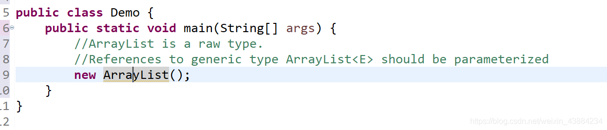 2.3 泛型示例 示例1 : 我们创建一个ArrayList,看到eclipse发出黄线警告,这是为什么呢? 原因:ArrayList定义时使用了泛型,在声明时需要指定具体的类型