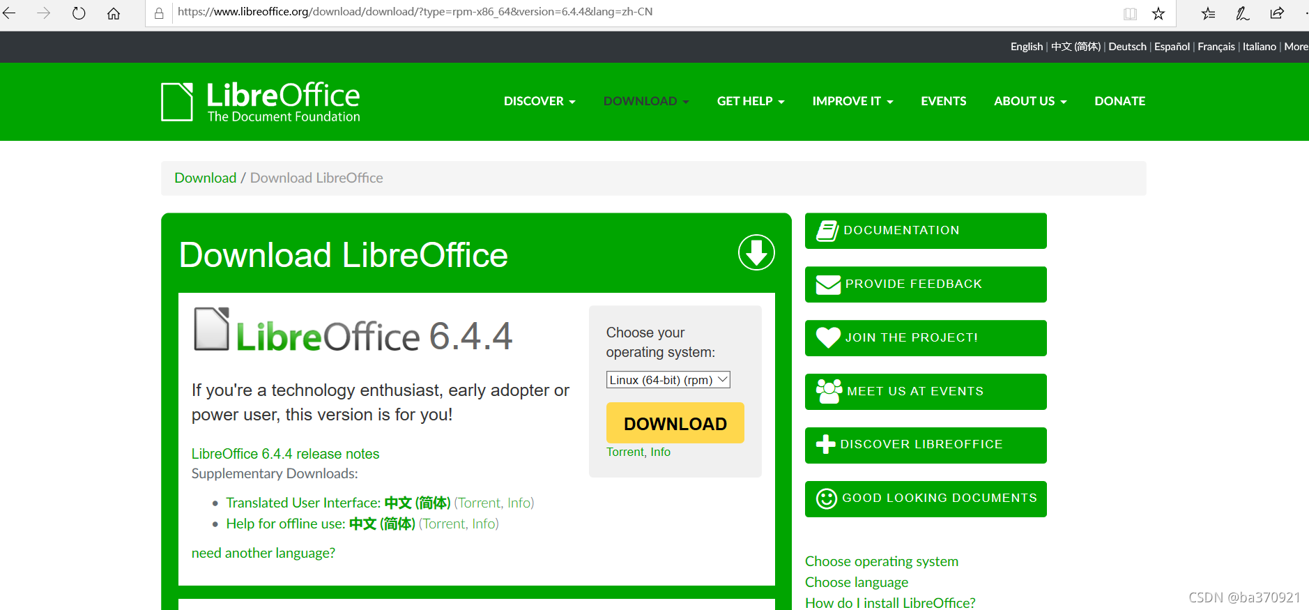 根据需求登录?LibreOffice官网?下载对应版本的安装包,我们计划使用rpm的方式来进行安装,所以选择Linux x86_64(rpm)