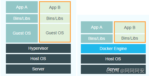 ???????? -虚拟机的Guest OS即为虚拟机安装的操作系统,它是一个完整操作系统内核;虚拟机的Hypervisor层可以简单理解为一个硬件虚拟化平台,它在Host OS是以内核态的驱动存在的。而虚拟机的Guest OS层和Hypervisor层在docker中被Docker Engine层所替代,Docker有着比虚拟机更少的抽象层,Docker运行在容器上的程序通过Docker引擎直接使用实际物理机的硬件资源。
