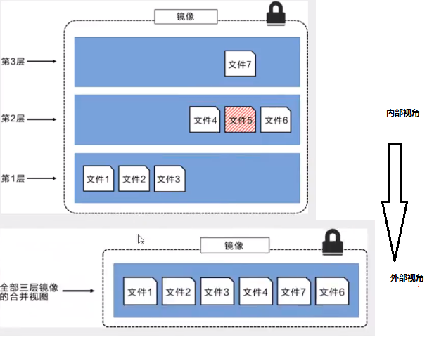 - ?外部视角:在镜像外部来看,多层基础镜像层相互叠加,它们重叠在一起。除了最下面一层,其它层都会有一个调用指针指向下一层。对外呈现一个统一的、完整的文件视角,这样就隐藏了多层的存在,在用户的角度看来,只存在一个文件系统。