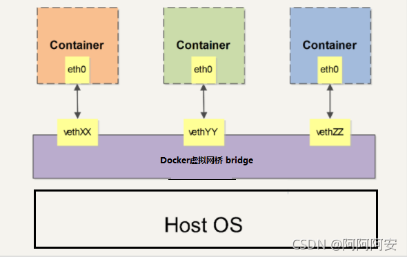veth-pair 接口,这对接口一端在容器内,即 eth0 ;另一端在本地并被默认挂载到 bridge 虚拟网桥上,名称以 veth 开头。同时,会给该容器自动分配一个与 bridge 虚拟网桥同一网段的子地址。(比如172.17.0.x) veth-pair 接口的特点是,当数据包发送到一个接口时,另外一个接口也可以收到相同的数据包。通过这种方式,主机可以跟容器通信,容器之间也可以相互通信。Docker 就创建了在主机和所有容器之间一个虚拟共享网络。
