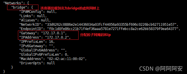bridge 虚拟网桥, 同时,Docker 随机分配一个本地未占用的私有网段(在 RFC1918 中定义)中的一个IP地址给 bridge 网桥接口。 比如典型的172.17.0.1 - 每当创建一个 Docker 容器的时候,同时会创建该容器的一对