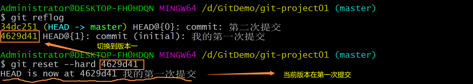 git reflog 命令可以查看历史提交的记录  这里的版本号是精简版的版本号,只是完整版版本号的前7位
