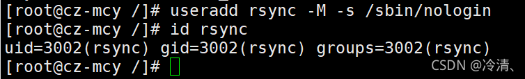 useradd rsync -M -s /sbin/nologin #创建一个rsync的虚拟用户,不创建家目录,设置成不能登录到系统模式。
