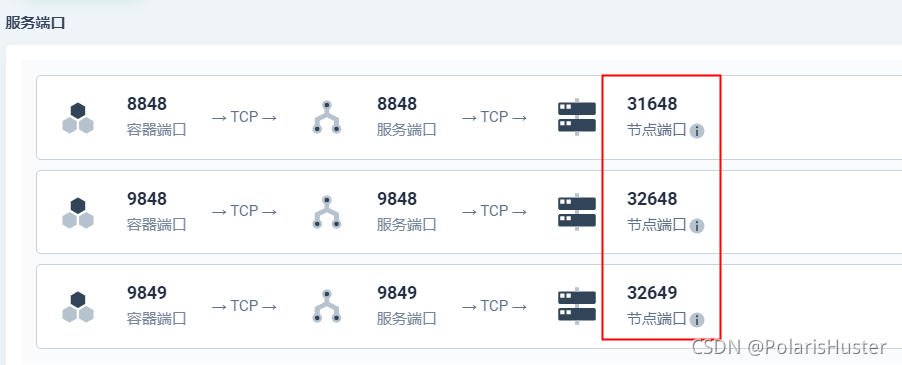 所以如果使用nacos-client 2.0.1版本,必须保证nacos server对应的9849端口开发,在使用docker或者k8s部署nacos-server时需要将对应的端口暴漏出来,特别需要注意的是k8s环境,k8s默认端口开放范围为30000-32768,使用kubesphere部署时对外暴露的NodePort端口是随机生成的,这时我们就需要对其进行修改,保证对外暴露端口相差1000,如下图所示:
