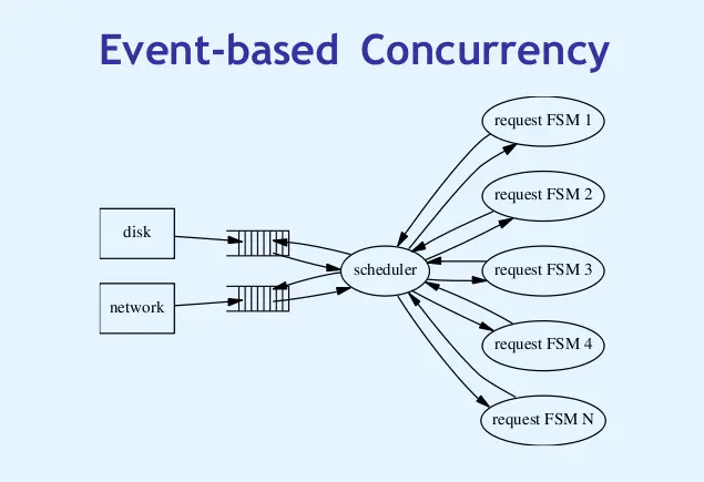 ? 事件驱动并发将每个task视为有限状态机(FSM)进行处理,其中FSM状态间的转换由event触发。可以看到,基于线程的并发依赖线程上下文(thread context),而事件驱动并发的服务器维护每个task各自的状态。