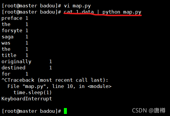 我们需要的map结果是需要统计次数的; 因此输出要改为:print("%s\t%s" % (s,1)),注释掉print(type(ss)) 。 执行:cat 1.data | python map.py 结果显示如下: