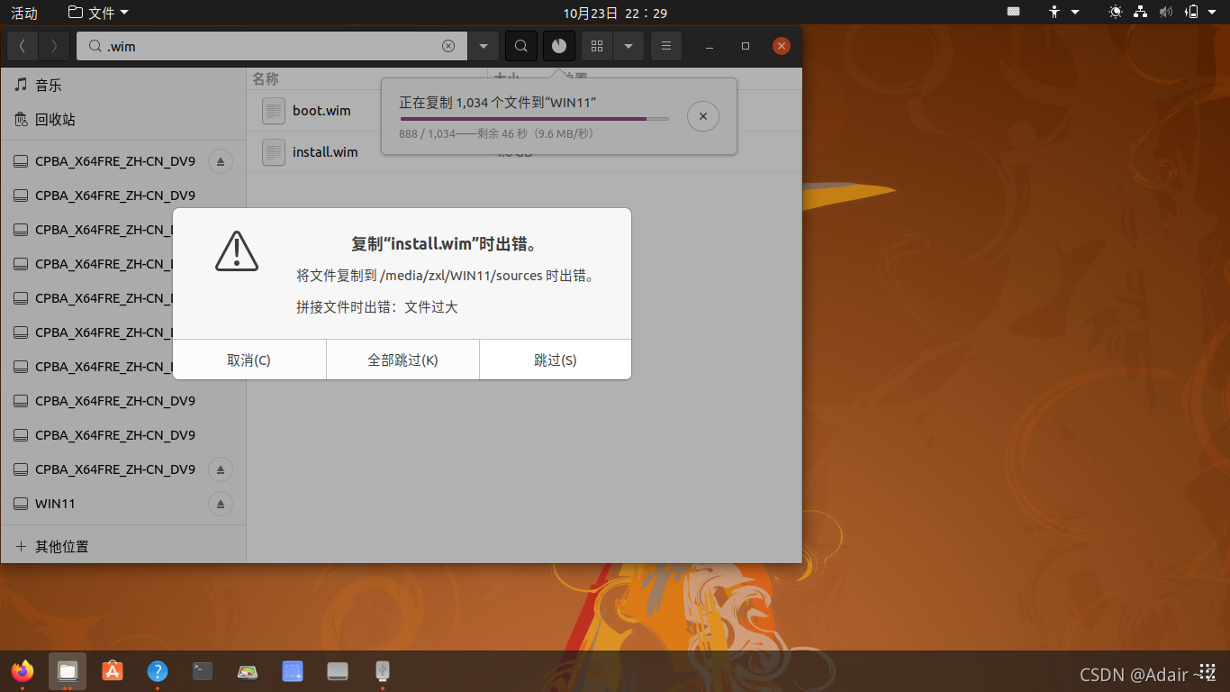 ?此时拷贝出错,显示部分文件过大无法拷贝。(因为使用的是FAT32文件系统-最大支持文件4G)肯定有文件超过4G。