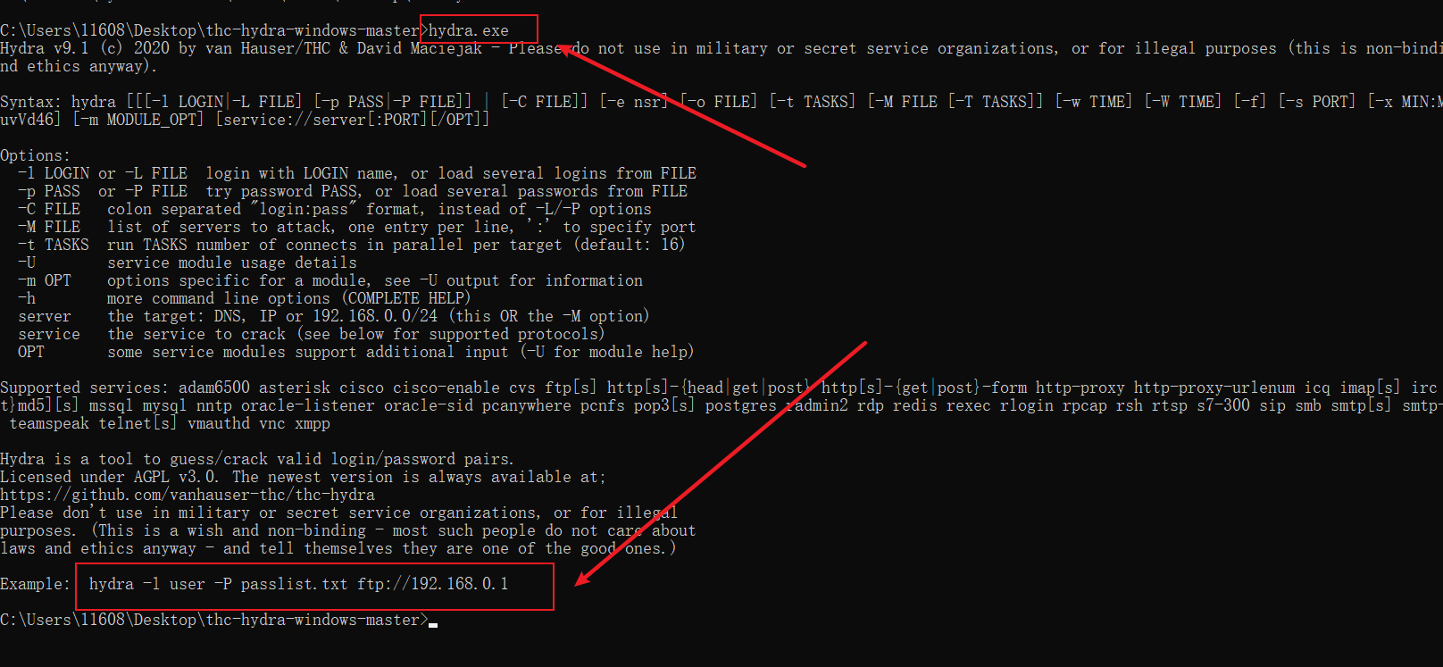 在cmd下移动至hydra目录下即可使用,如图