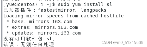 1.在屏幕输出火车 我们在当前用户为普通用户的情况下键入“sudo yum install -y sl”命令, 但是当我们直接输入命令,系统会提示我们没有可用的安装包,我们使用 “sudo yum install -y epel-release"命令,再使用“sudo yum install -y sl”命令即可安装成功。
