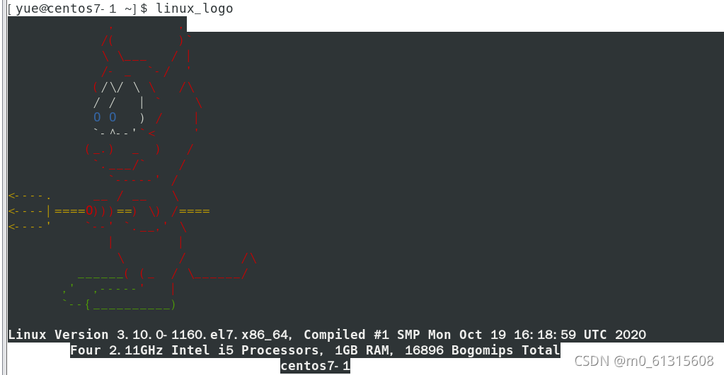 4.打印Linux的logo,使用“sudo yum install -y linux_logo”安装,安装完成后, 我们使用“linux_logo”命令,屏幕会输出一只企鹅的Linux logo。