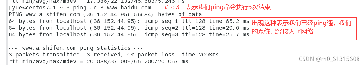 如果我们使用的是虚拟机装Linux系统(本人安装的centos7系统),我们首先查看我们的虚拟机是否已经接入网络,我们使用“ping”命令是ping百度的网站,ping通则说明我们的系统已经接入了网络,没有ping通我们则需要将我们的系统接入网络。