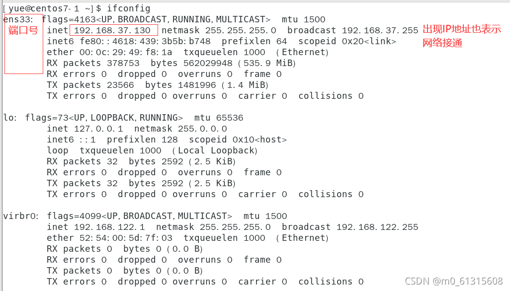 如果没有ping通,我们先使用“ifconfig”命令查看我们系统接入网络的端口 “ifconfig”命令显示的端口号并不是唯一,由你的系统及网络接入方式决定。