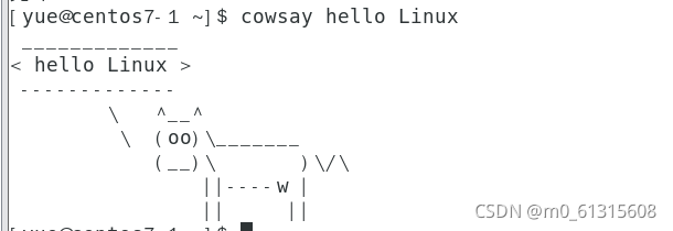 ?2.使用“sudo yum install -y cowsay”,安装成功后我们输入“cowsay +(你想说的话)”可以以马(我觉得像马)吐字的形式,吐出“你想说的话”。 eg:我们输入“cowsay hello Linux”