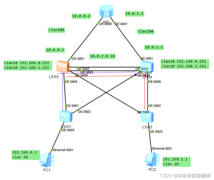 如图LSW1和LSW2是接入层交换机,而LSW3和LSW4是汇聚层交换机,LSW3和4作为每个VLAN的网关。