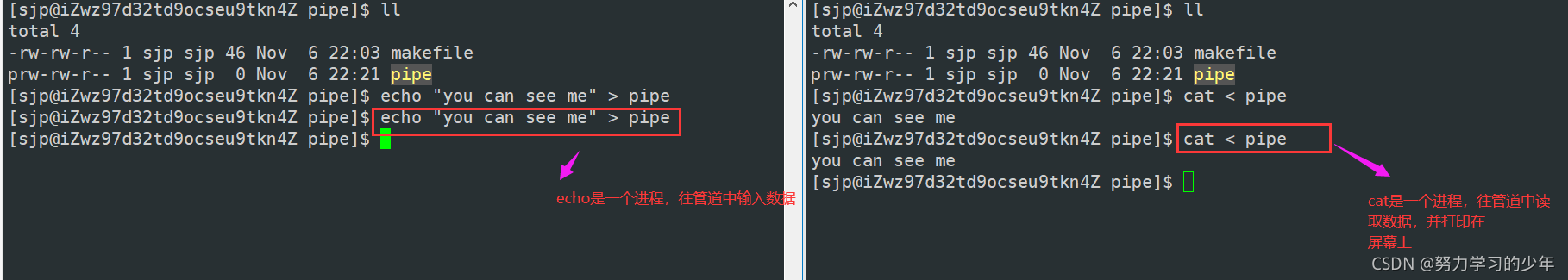 概念 匿名管道是没有名字的,它是特殊文件,它只创建在内存中,不存在我们磁盘中,即用完就销毁了。