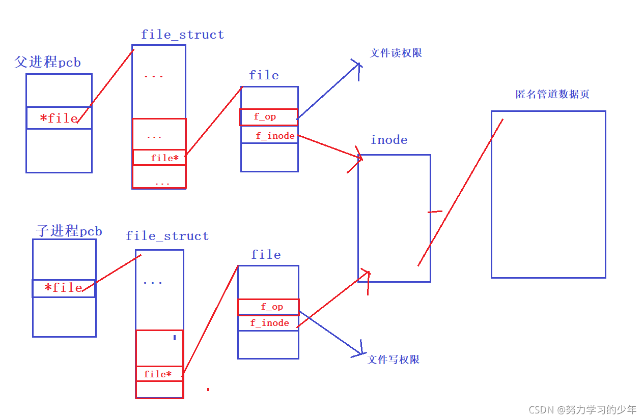 当父进程创建子进程的时候,系统会给子进程创建file_struct和file的数据结构,然后将父进程的file_struct和file的中数据拷贝给子进程的的file_struct和file,这样父进程和子进程就能够指向同一个管道。