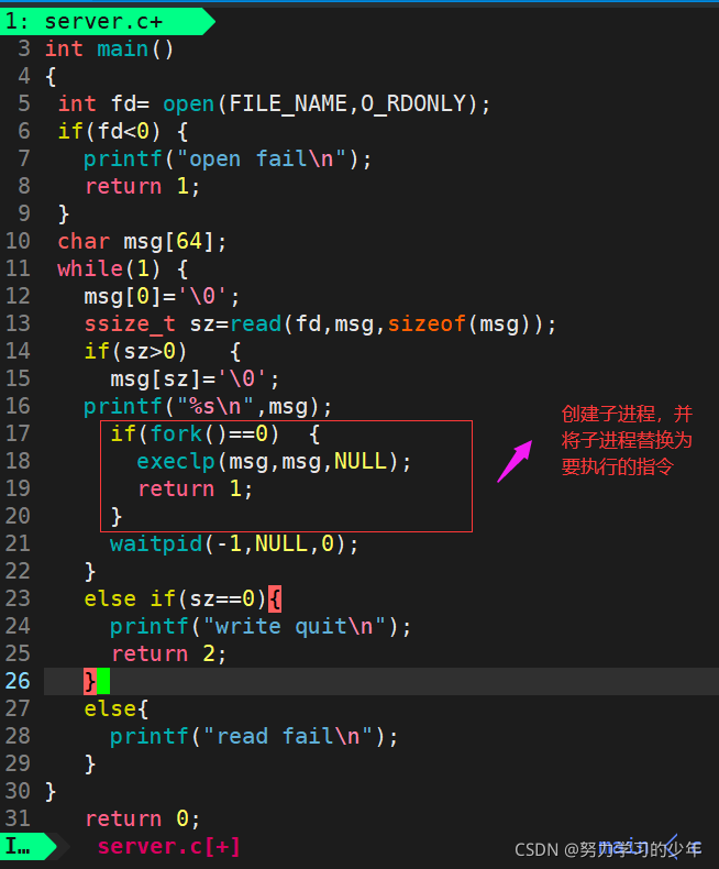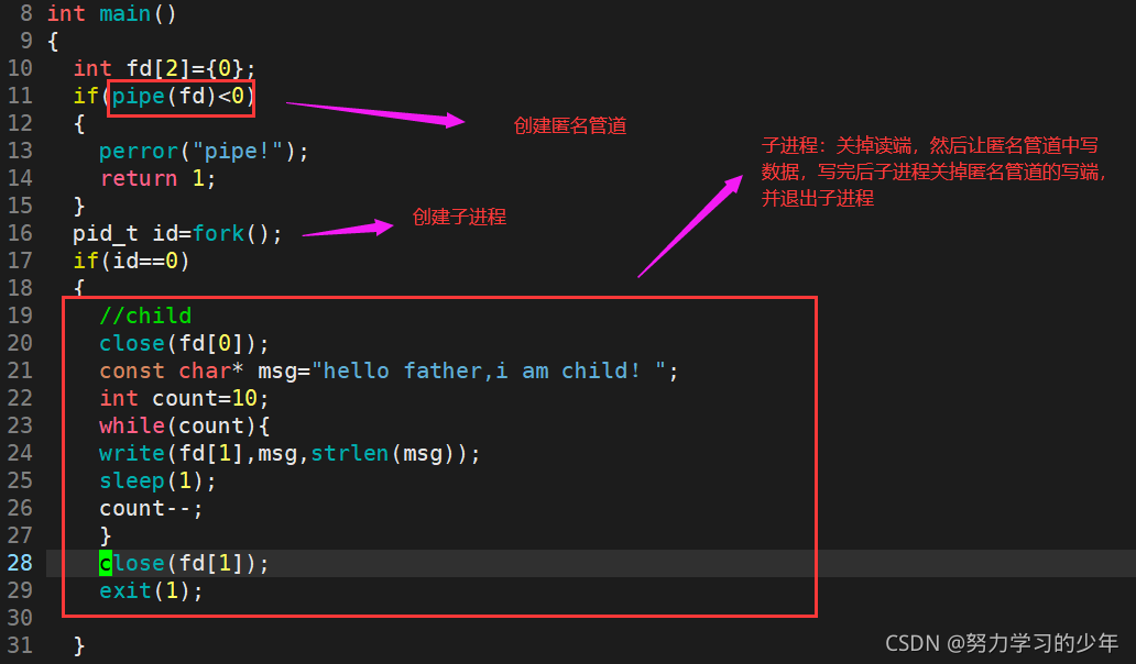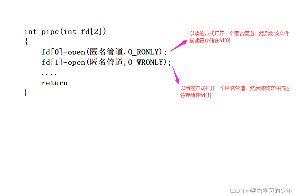 fd:文件描述符数组,其中将f[0]存储读端的文件描述符,fd[1]存储写端的文件描述符。