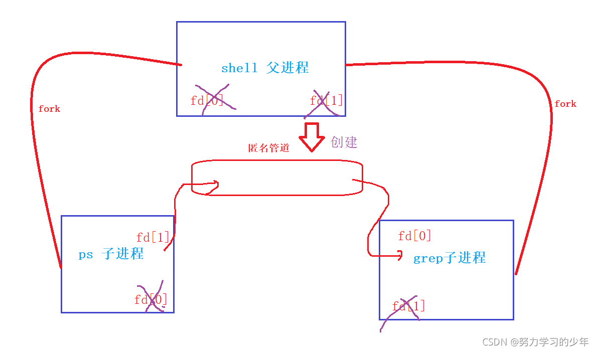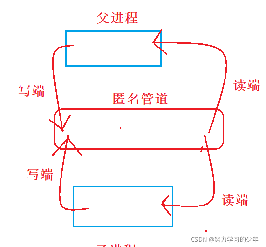 1.父进程利用pipe创建出一个匿名管道,得到的文件表示符指向管道的读端和写端