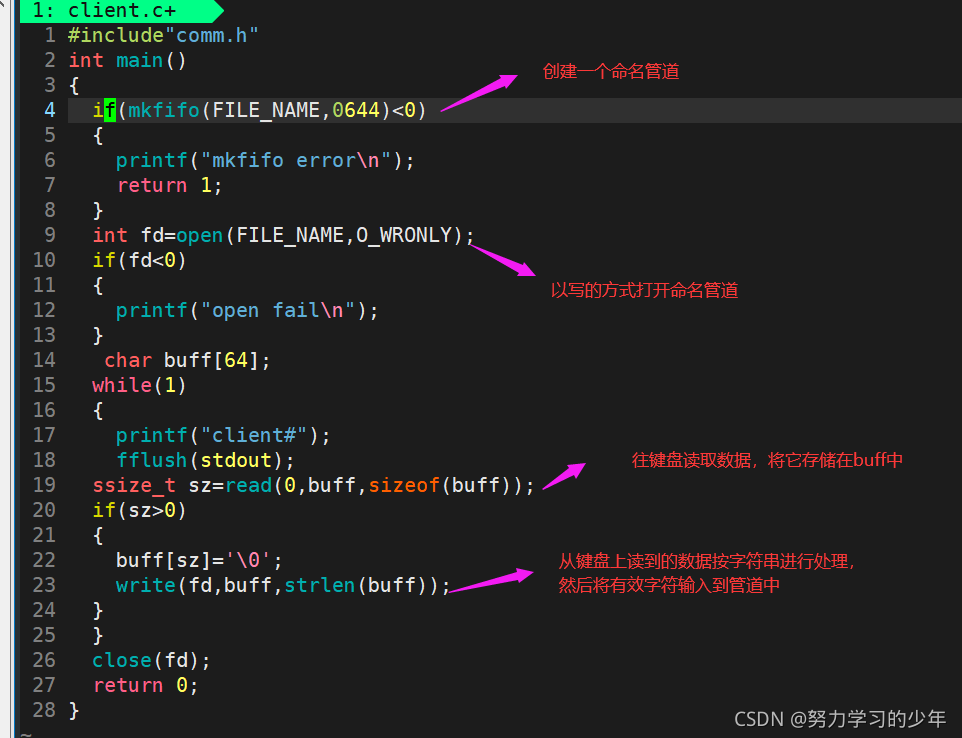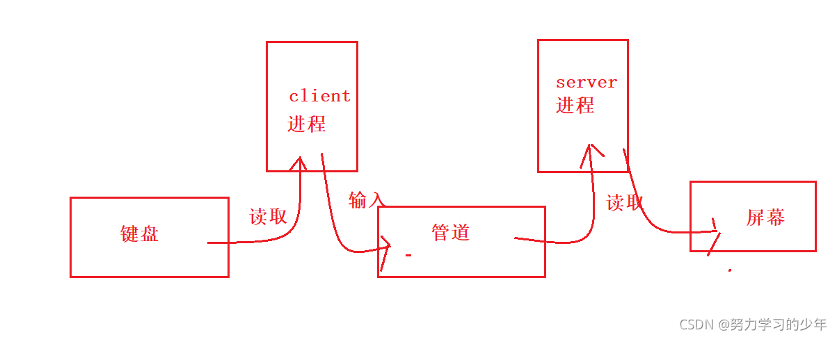 思路:client进程从键盘读取到的数据传输到命名管道上,然后server进程再去从命名管道中读取数据,然后将信息打印到屏幕上。?