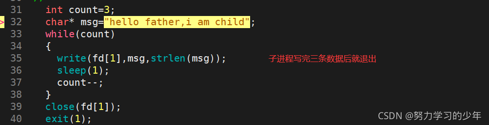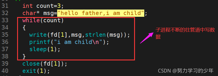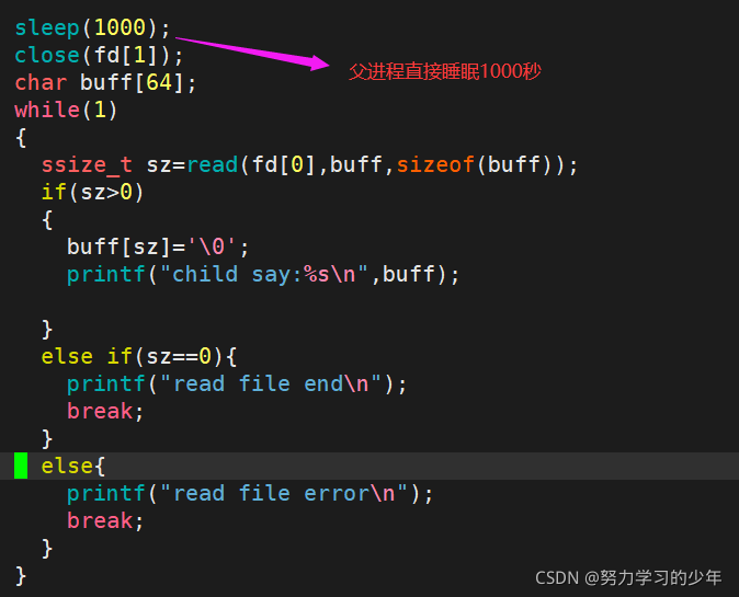 当子进程往管道中写入一定的数据后,就不再往管道中写入数据,并让父进程一直读取管道中的数据。