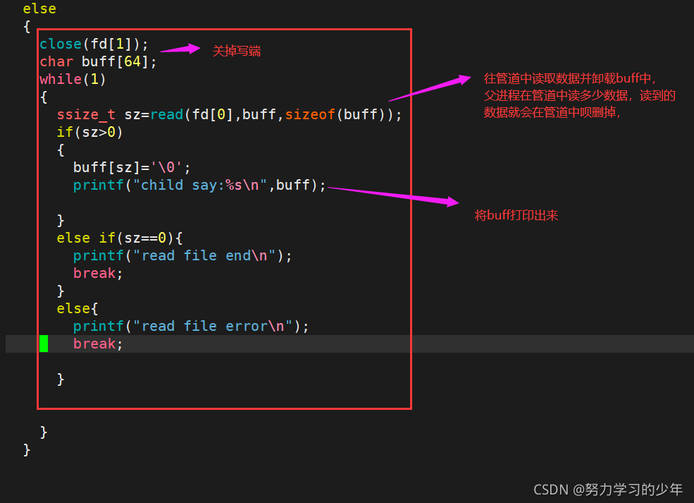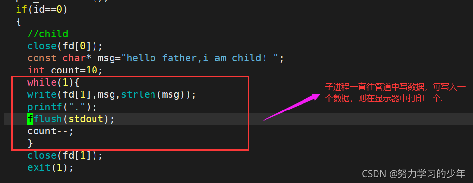 当子进程往管道中写完数据后就关闭写端,父进程一直在读取.