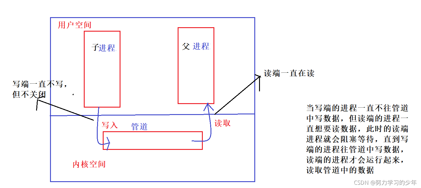 1.当管道中没数据的时候,读端的进程就会被阻塞等待(前提写端没有关闭)。