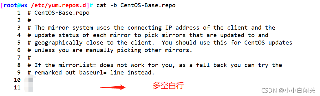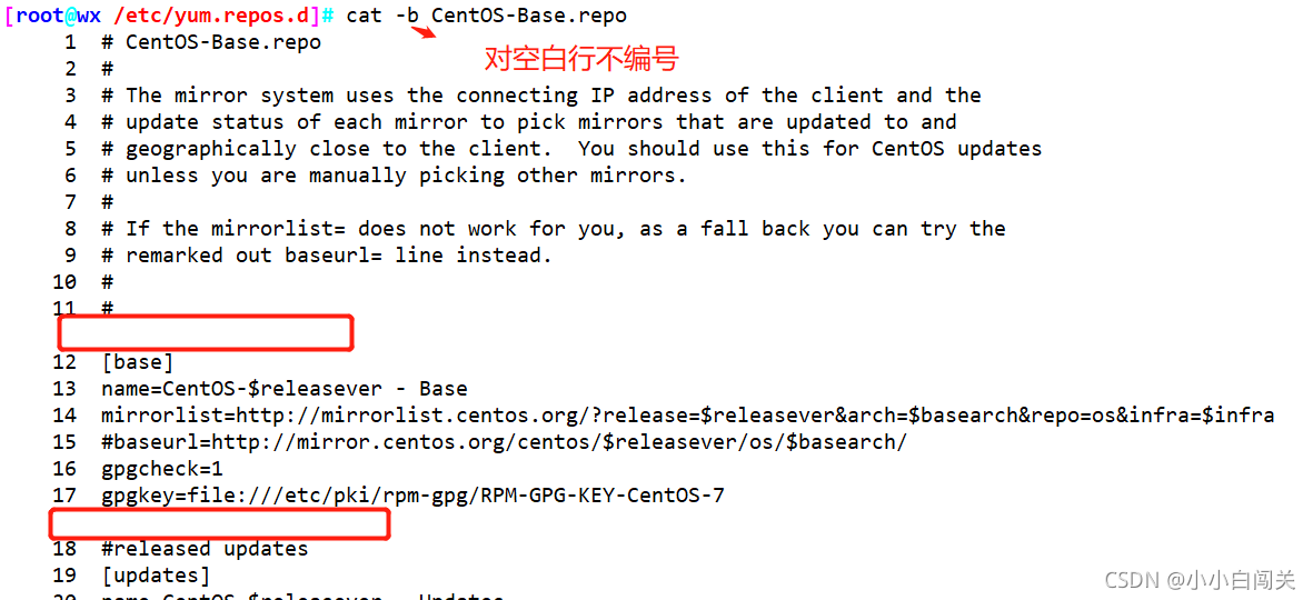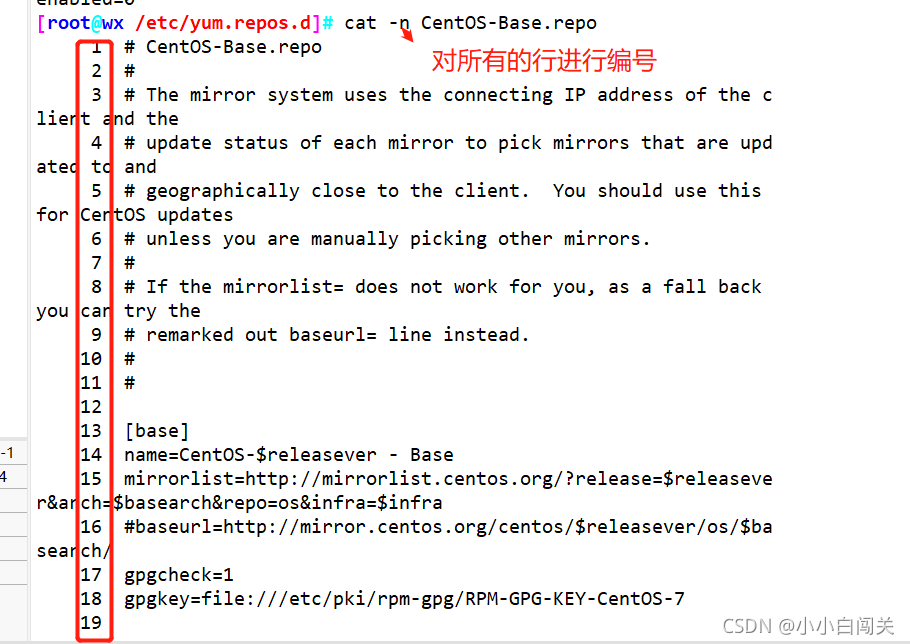 [root@wx /etc/yum.repos.d]# cat -b CentOS-Base.repo