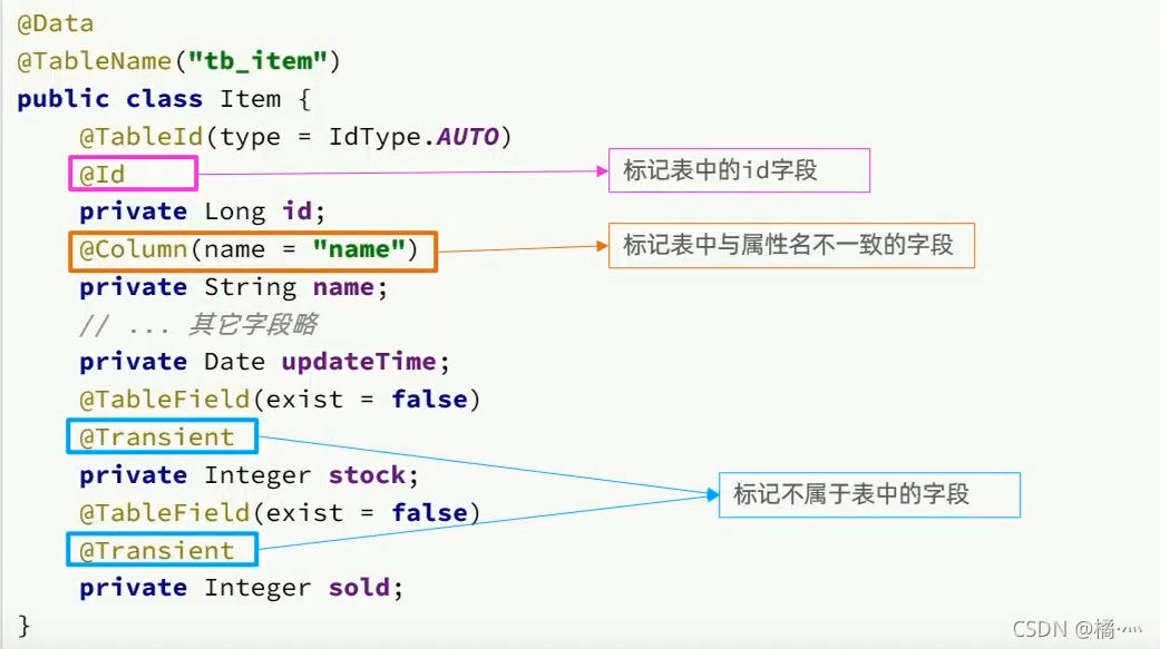 - Canal推送给canal-client的是被修改的这一行数据(row),而我们引入的canal-client则会帮我们把行数据封装到Item实体类中。这个过程中需要知道数据库与实体的映射关系,要用到JPA的几个注解