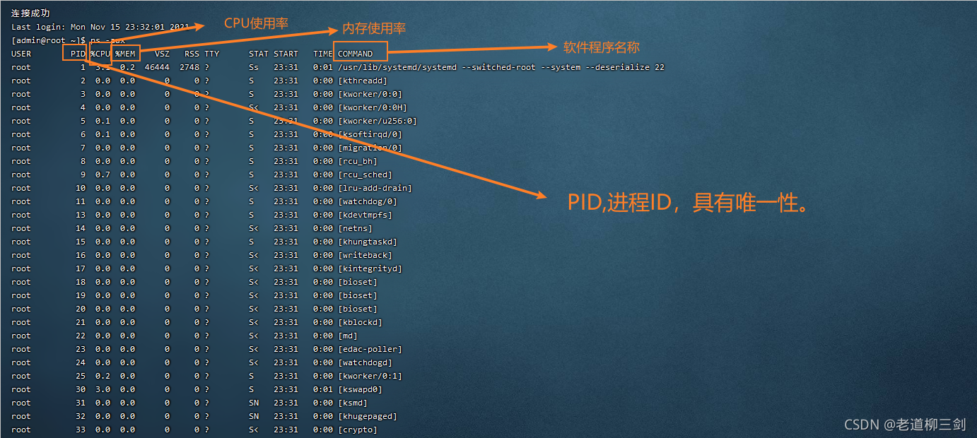 | ps -aux | 查看当前系统中正在执行程序的详细状况 | | kill [-9] 进程代号 | 终止指定代号的进程,-9表示强行终止 | | top | 动态显示运行中的进程并且排序 |
