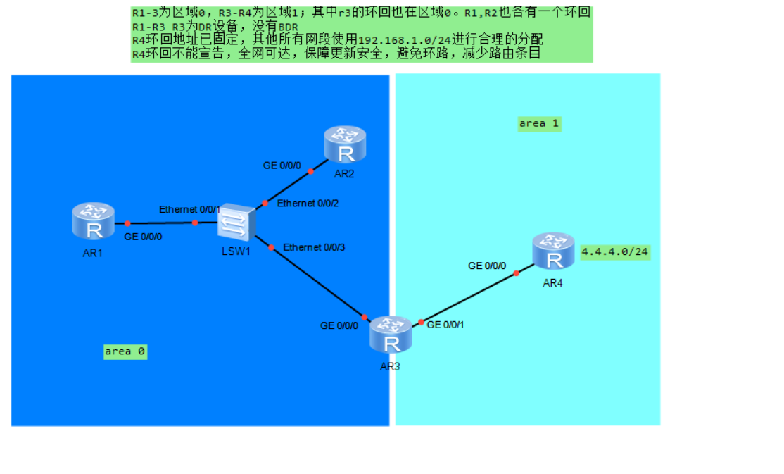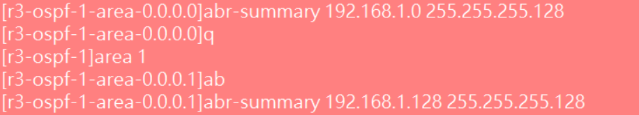 [r1-ospf-1-area-0.0.0.0]network 192.168.1.0?0.0.0.255 [r2-ospf-1-area-0.0.0.0]network 192.168.1.0?0.0.0.255 [r3-ospf-1-area-0.0.0.0]network 192.168.1.0?0.0.0.255 [r4-ospf-1-area-0.0.0.0]network 192.168.1.0?0.0.0.255 - 由于没有宣告r4的环回,所以需要添加缺省,以r3为ABR