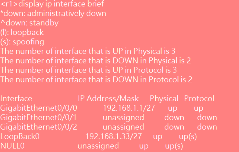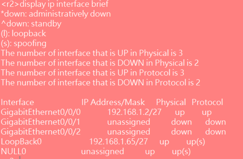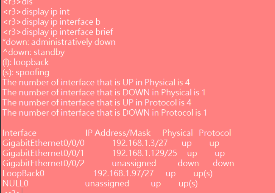 思路:由于OSPF区域划分的特性,每个区域划分为一个网段,这样做有利于手工汇总 先将192.168.1.0/24借1位划分两个网段: area0 :192.168.1.0/25 ;area1:192.168.1.128/25 area0的网段借2位划分为4个网段 : 广播域1:192.168.1.0/27 ;r1的环回:192.168.1.32/27;r2的环回:192.168.1.64/27? r3的环回:192.168.1.96/27 area1网段不需要子网划分 - 配置端口ip地址和每个路由器的环回地址