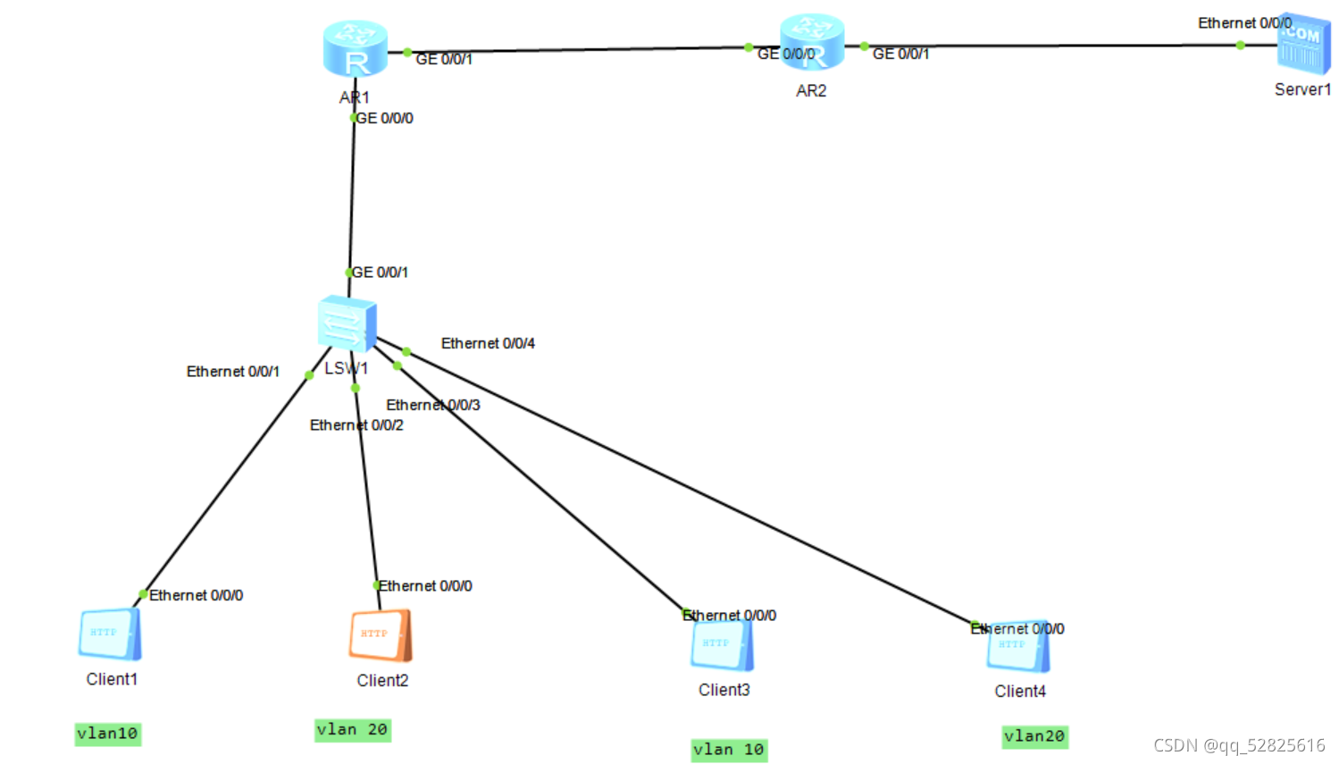 LSW1 <Huawei>undo terminal monitor ? ? ? ? ? ? ? ? ? ? ? ? ? ? ? ? ? ? ? ?关闭弹窗 <Huawei>sys ? ? ? ? ? ? ? ? ? ? ? ? ? ? ? ? ? ? ? ? ? ? ? ? ? ? ? ? ? ? ? ? ? ? ? ?用户视图 [Huawei]sysname LSW1 ? ? ? ? ? ? ? ? ? ? ? ? ? ? ? ? ? ? ? ? ? ? ? ? ? ? ? ?更改LSW1? [LSW1]user-interface console 0 ? ? ? ? ? ? ? ? ? ? ? ? ? ? ? ? ? ? ? ? ? 用不超时 ? ? ? ? ? ? ? ? ? ? ? ? ? ? ? ? ? ? ? ? ? ? ? ? ? ? ? ? ? ? ? ? ? ? ? ? ? ? ? ?? [LSW1-ui-console0]id 0 0 [LSW1-ui-console0]q ? ? ? ? ? ? ? ? ? ? ? ? ? ? ? ? ? ? ? ? ? ? ? ? ? ? ? ? ?退回到上一级 [LSW1]vlan batch 10 20 ? ? ? ? ? ? ? ? ? ? ? ? ? ? ? ? ? ? ? ? ? ? ? ? ? ? ?创建vlan10、20 [LSW1]int e0/0/1 ? ? ? ? ? ? ? ? ? ? ? ? ? ? ? ? ? ? ? ? ? ? ? ? ? ? ? ? ? ? ? ? 进入e0/0/1接口 [LSW1-Ethernet0/0/1]port link-type access ? ? ? ? ? ? ? ? ? ? ?选择access模式 [LSW1-Ethernet0/0/1]port default vlan 10 ? ? ? ? ? ? ? ? ? ? ? ?划给vlan10 [LSW1-Ethernet0/0/1]int e0/0/2 ? ? ? ? ? ? ? ? ? ? ? ? ? ? ? ? ? ? ? 进入e0/0/2接口 [LSW1-Ethernet0/0/2]port link-type access ? ? ? ? ? ? ? ? ? ? 选择access模式 [LSW1-Ethernet0/0/2]port default vlan 20 ? ? ? ? ? ? ? ? ? ? ? ?划给vlan20 [LSW1-Ethernet0/0/2]int e0/0/3 ? ? ? ? ? ? ? ? ? ? ? ? ? ? ? ? ? ? 进入e0/0/3接口 ? ? ?? [LSW1-Ethernet0/0/3]port link-type access ? ? ? ? ? ? ? ? ? ?选择access模式 [LSW1-Ethernet0/0/3]port default vlan 10 ? ? ? ? ? ? ? ? ? ? ? ?划给vlan10 [LSW1-Ethernet0/0/3]int e0/0/4 ? ? ? ? ? ? ? ? ? ? ? ? ? ? ? ? ? ? ? 进入e0/0/4接口 ? ? [LSW1-Ethernet0/0/4]port link-type access ? ? ? ? ? ? ? ? ? ? 选择access模式 [LSW1-Ethernet0/0/4]port default vlan 20 ? ? ? ? ? ? ? ? ? ? 划给vlan20 [LSW1-Ethernet0/0/4]q ? ? ? ? ? ? ? ? ? ? ? ? ? ? ? ? ? ? ? ? ? ? ? ? ? ? ?退回到上一级 [LSW1]int g0/0/1 ? ? ? ? ? ? ? ? ? ? ? ? ? ? ? ? ? ? ? ? ? ? ? ? ? ? ? ? ? 进入g0/0/1接口 ? [LSW1-GigabitEthernet0/0/1]port link-type trunk ? ? ? ? 选择trunk模式 [LSW1-GigabitEthernet0/0/1]port trunk allow-pass vlan all ? 允许所有标签流量通过