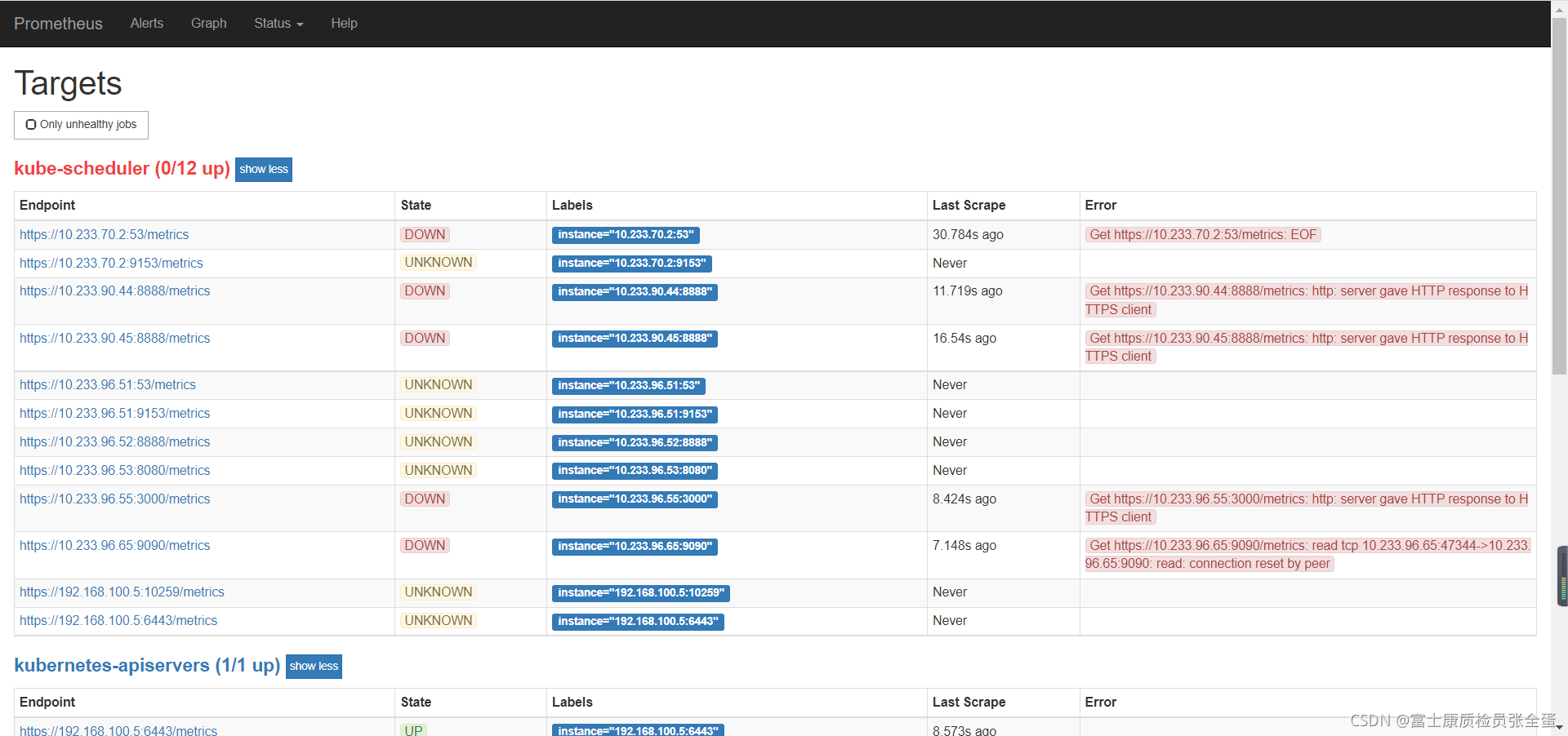 所以在安装好k8s之后,想要监控scheduler ,controller-manager,kube-proxy这些,最好按照上面步骤修改。修改之后重启kubelet和删除kube-proxy。(不要在业务已经跑起来的时候去做这些操作!)