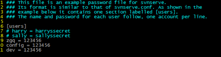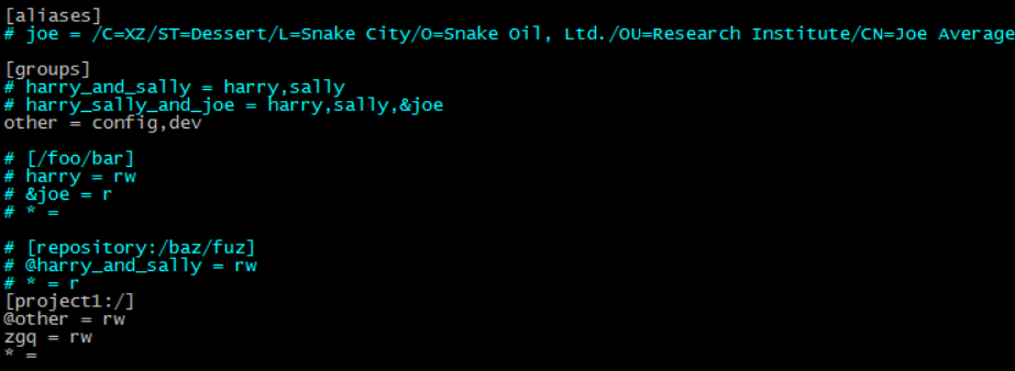 [groups]??分组管理权限,灵活运用可方便管理用户 [repository:/baz/fuz]??其中repository可以省略,[repository:/]或[/]表示该项目仓库根目录,[/foo/bar]表示仓库下/foo/bar目录。可以配置多项目录管理权限,以便针对不同目录的权限管理。