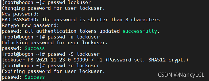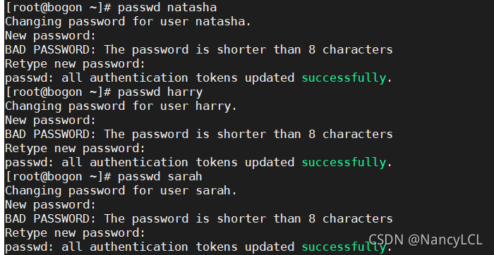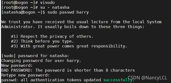 5.设置natasha 、 harry 和 sarah 的密码都是 123 ?6.创建用户lockuser, 并指定家目录为/home/lock, 然后锁定该用户 ?7.创建用户limituser, gid并将密码分别设为15,55,userid密码设为1666, 并让其密码在10天后过期 ?8.解锁lockuser, 并设定下次登录时必须修改密码 ?9.让natasha具备修改 harry密码的权限(sudo)     ?10.创建用户testuser并设置密码,修改用户名为normaluser ?11.删除lockuser 二.? 文件权限:? ? ??